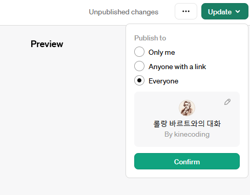 단 GPTs 앱의 경우 내 컴퓨터에만 저장하는 것이 아니라 앱스토어를 이용하는 모든 사람이 사용하는 것이기 때문에 다음과 같은 메뉴가 존재 한다.